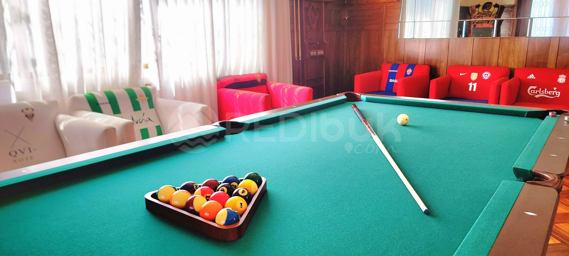 The space in this house is impressive, with a large garden that has room to play paddle tennis, an outdoor terrace next to a covered barbecue area. It has a spacious pool with a sea view, a game room, and includes a crib if coming with very young children.