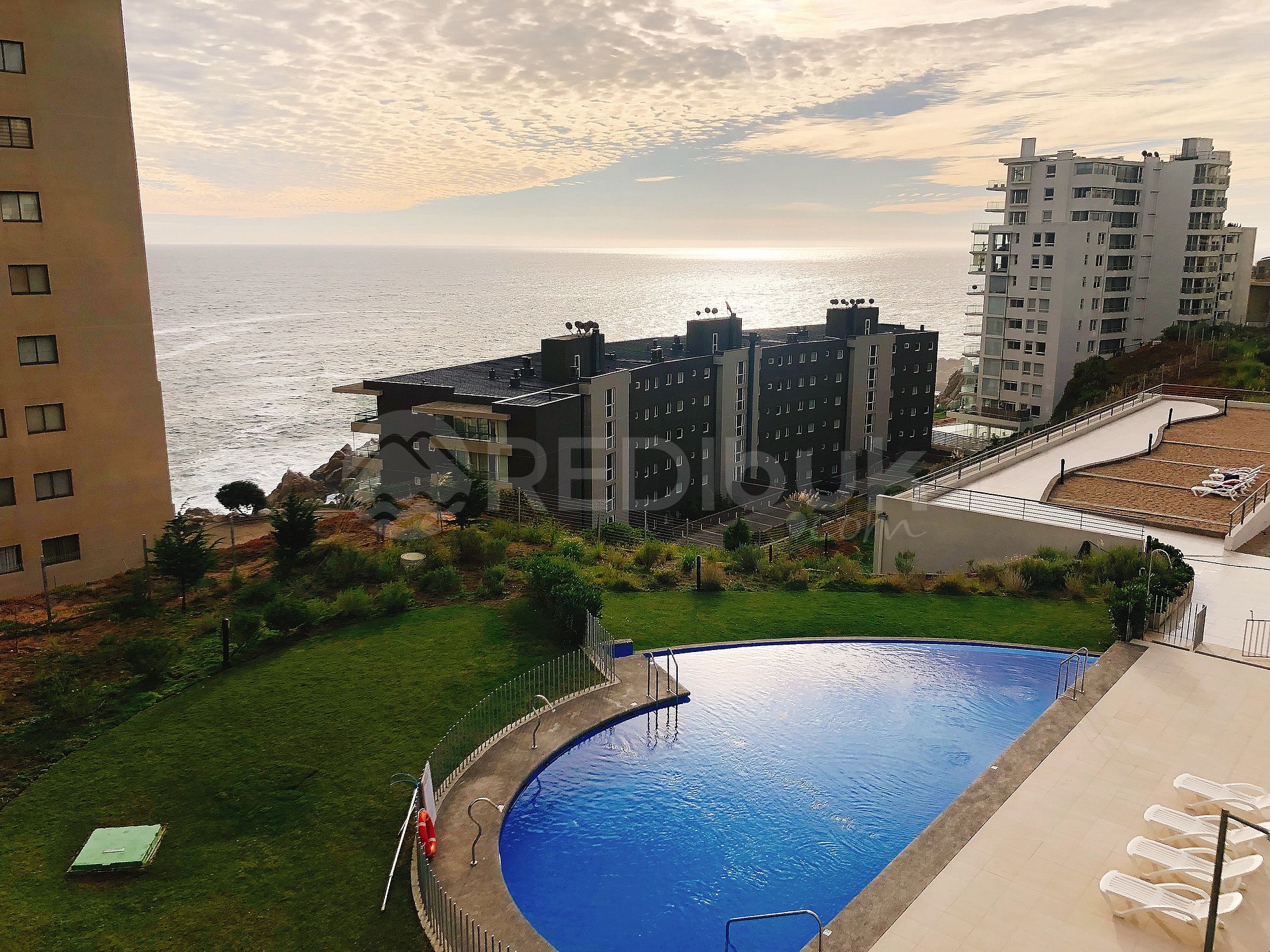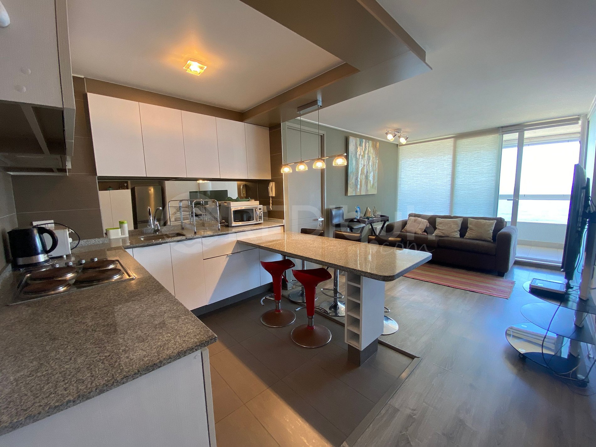 Beautiful ocean view apartment located in the exclusive sector of Costa de Montemar, Concón. Apartment with modern decoration, it has two en-suite bedrooms, a fully equipped American kitchen, a large enclosed terrace.