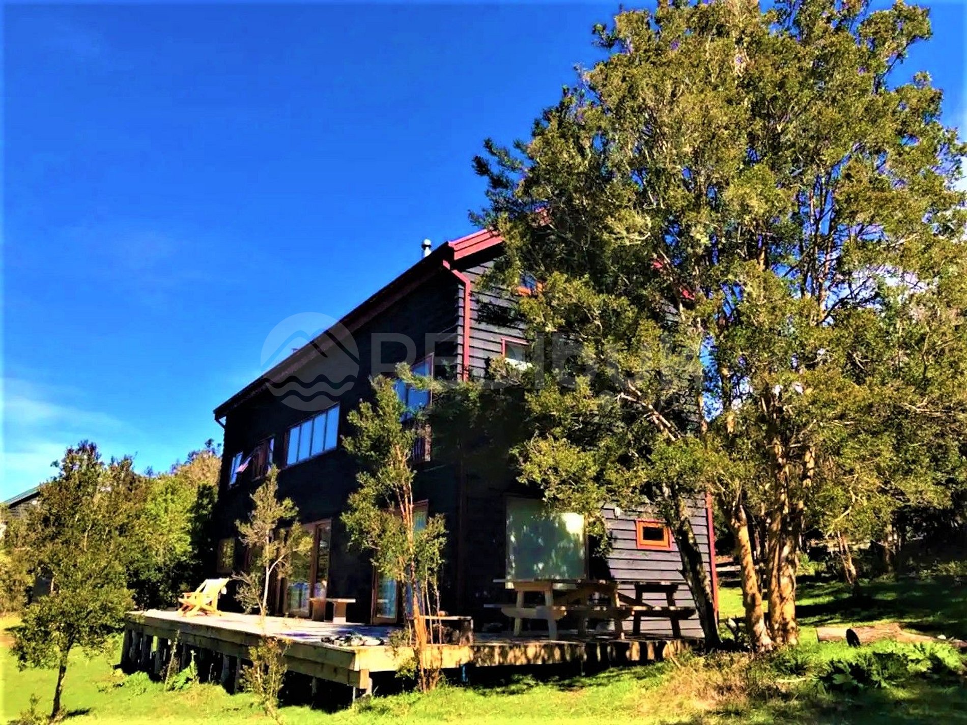 Casa de madera estilo chilote, playa en medio de bosque nativo de avellanos y arrayanes