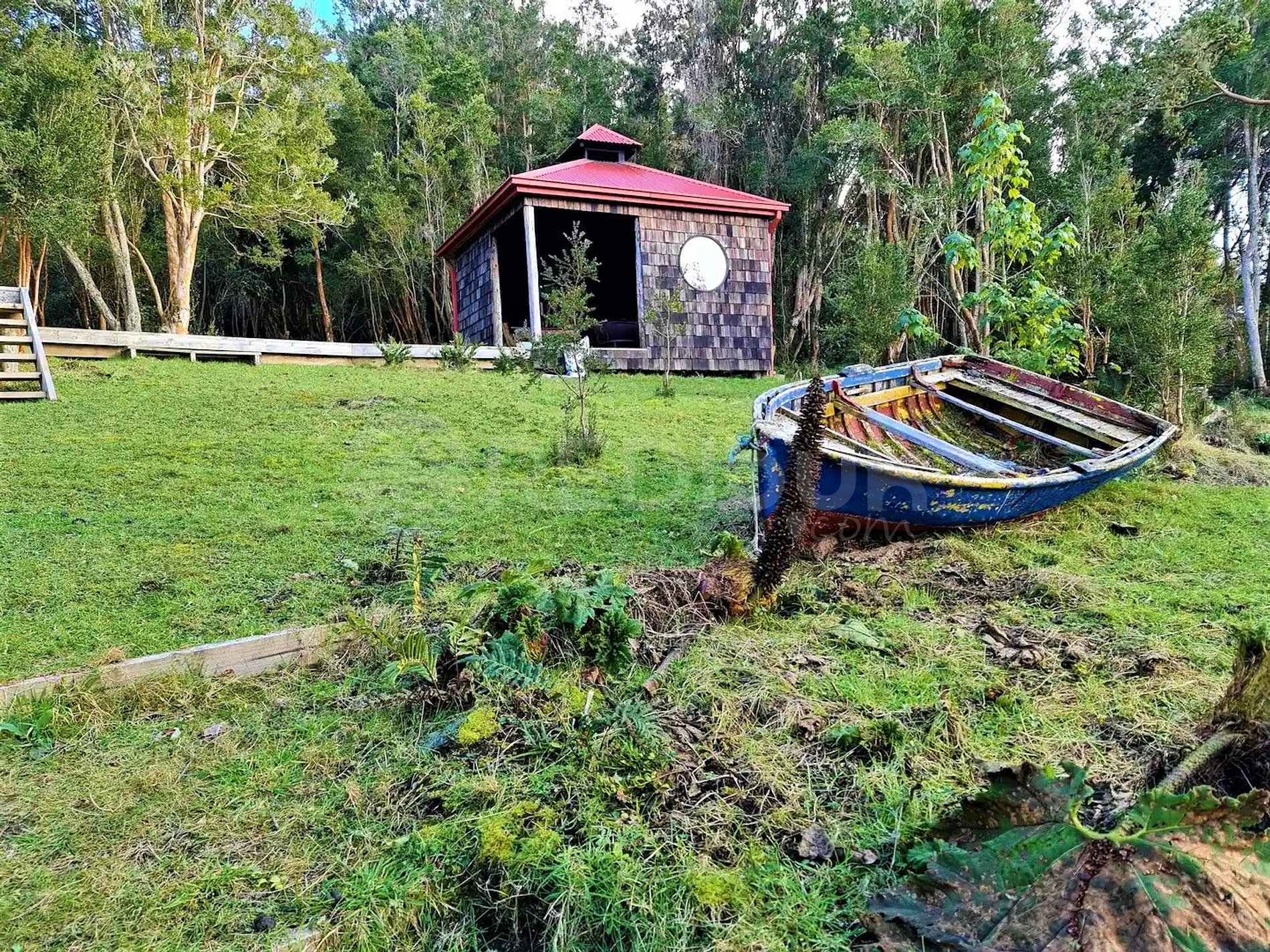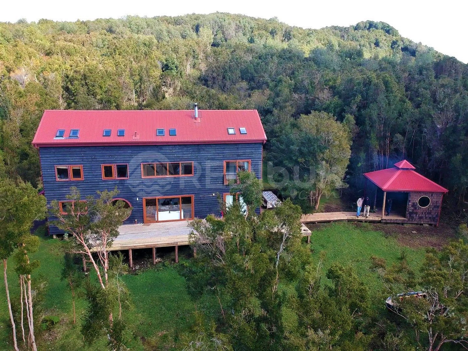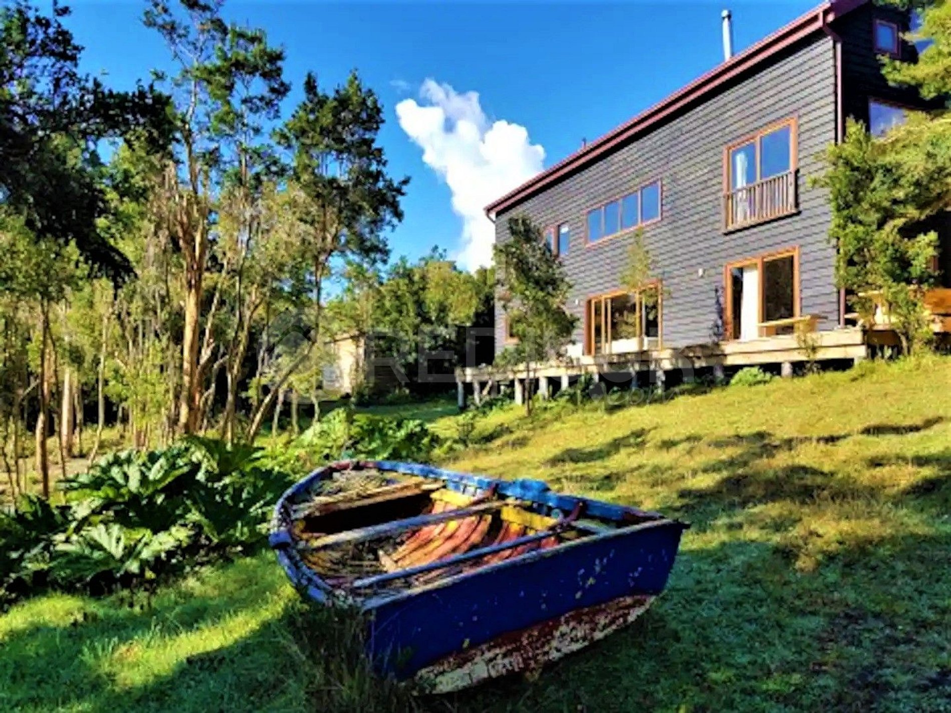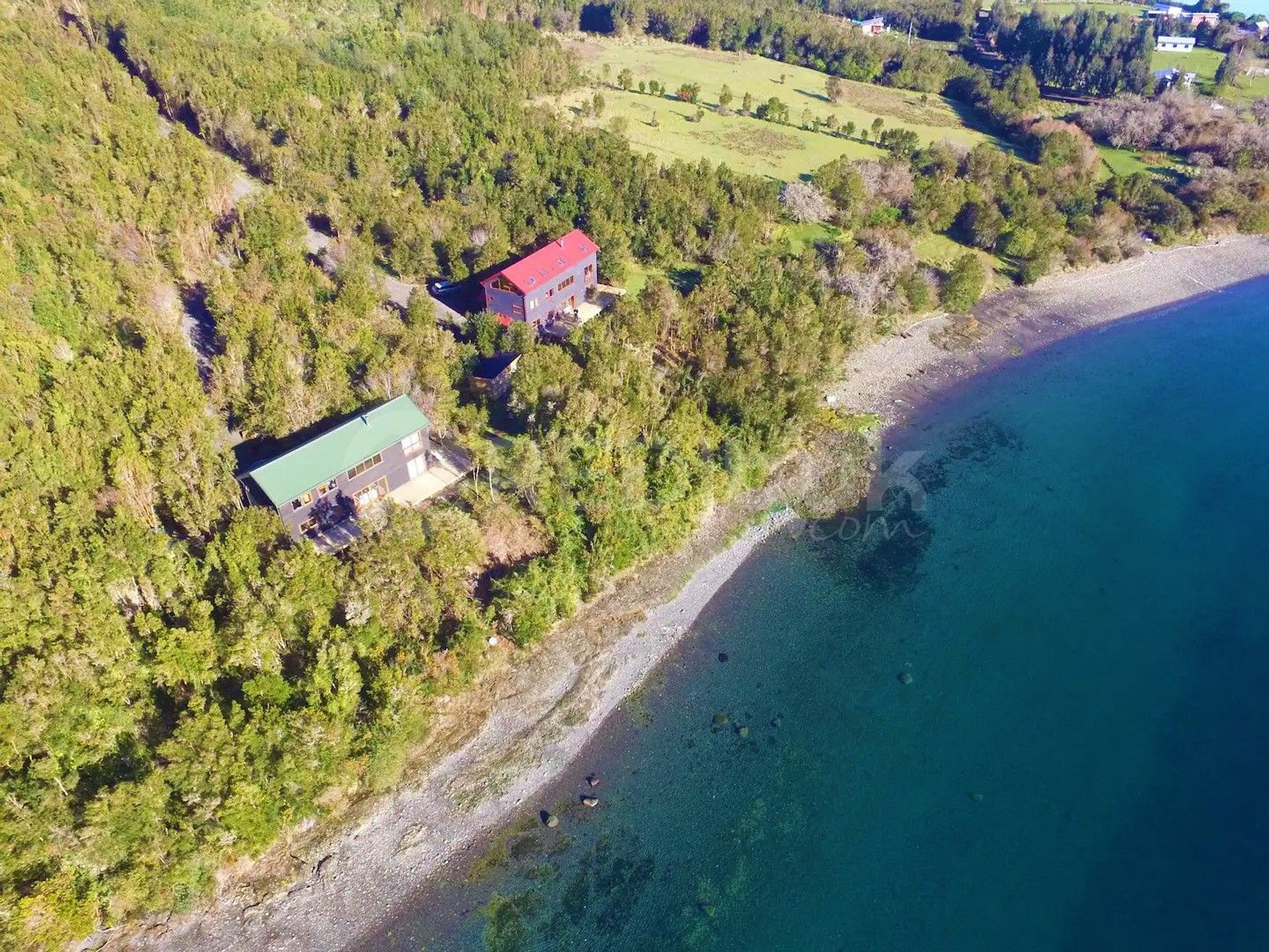 Casa de madera estilo chilote, playa en medio de bosque nativo de avellanos y arrayanes