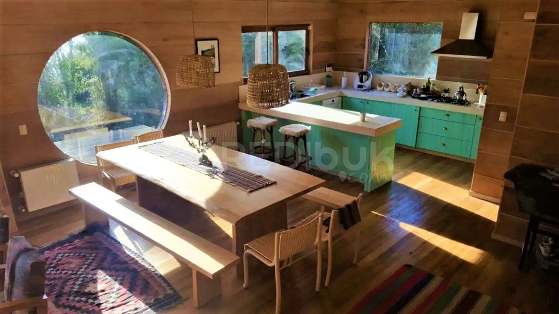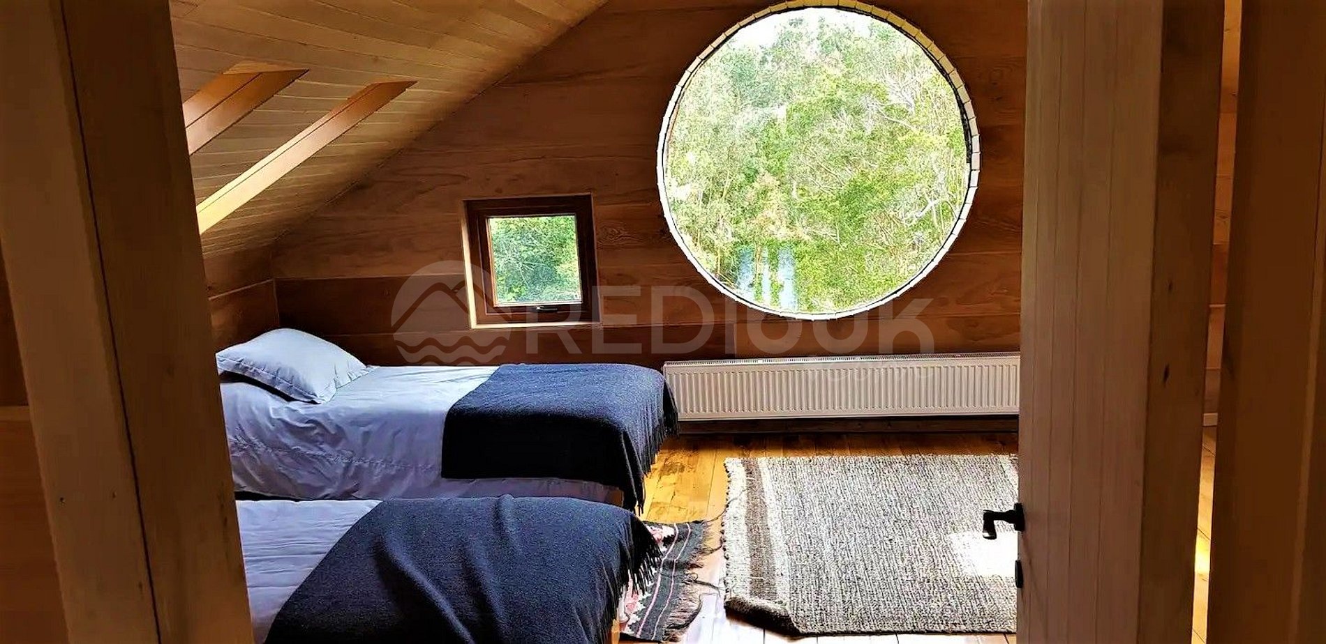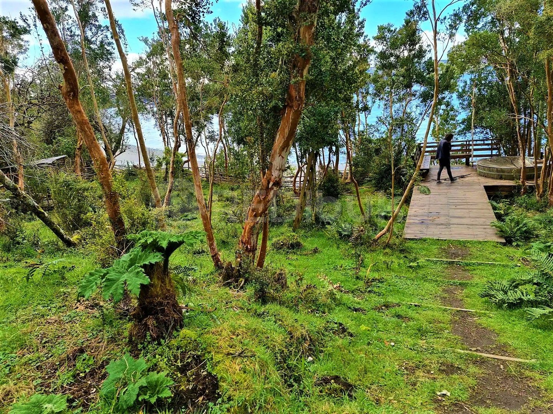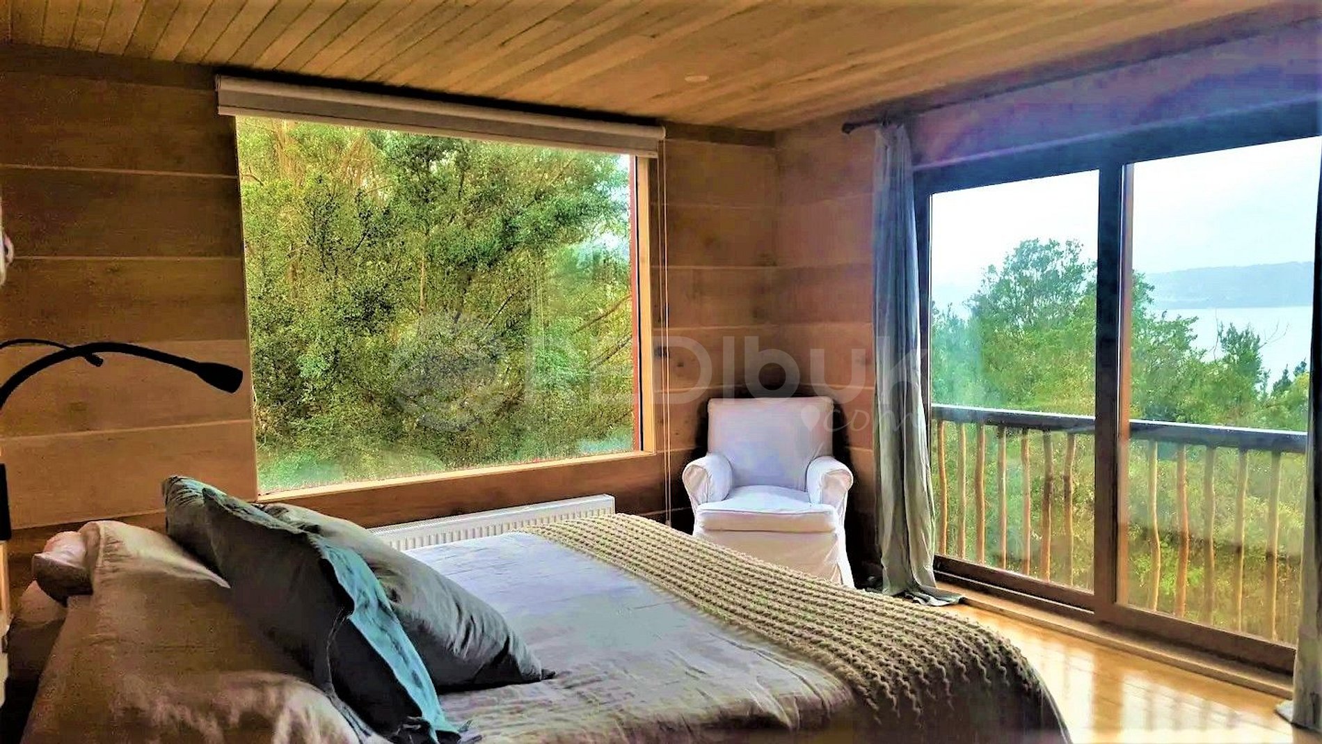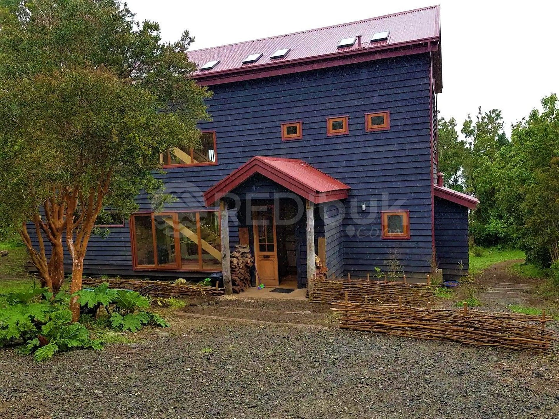 Casa de madera estilo chilote, playa en medio de bosque nativo de avellanos y arrayanes