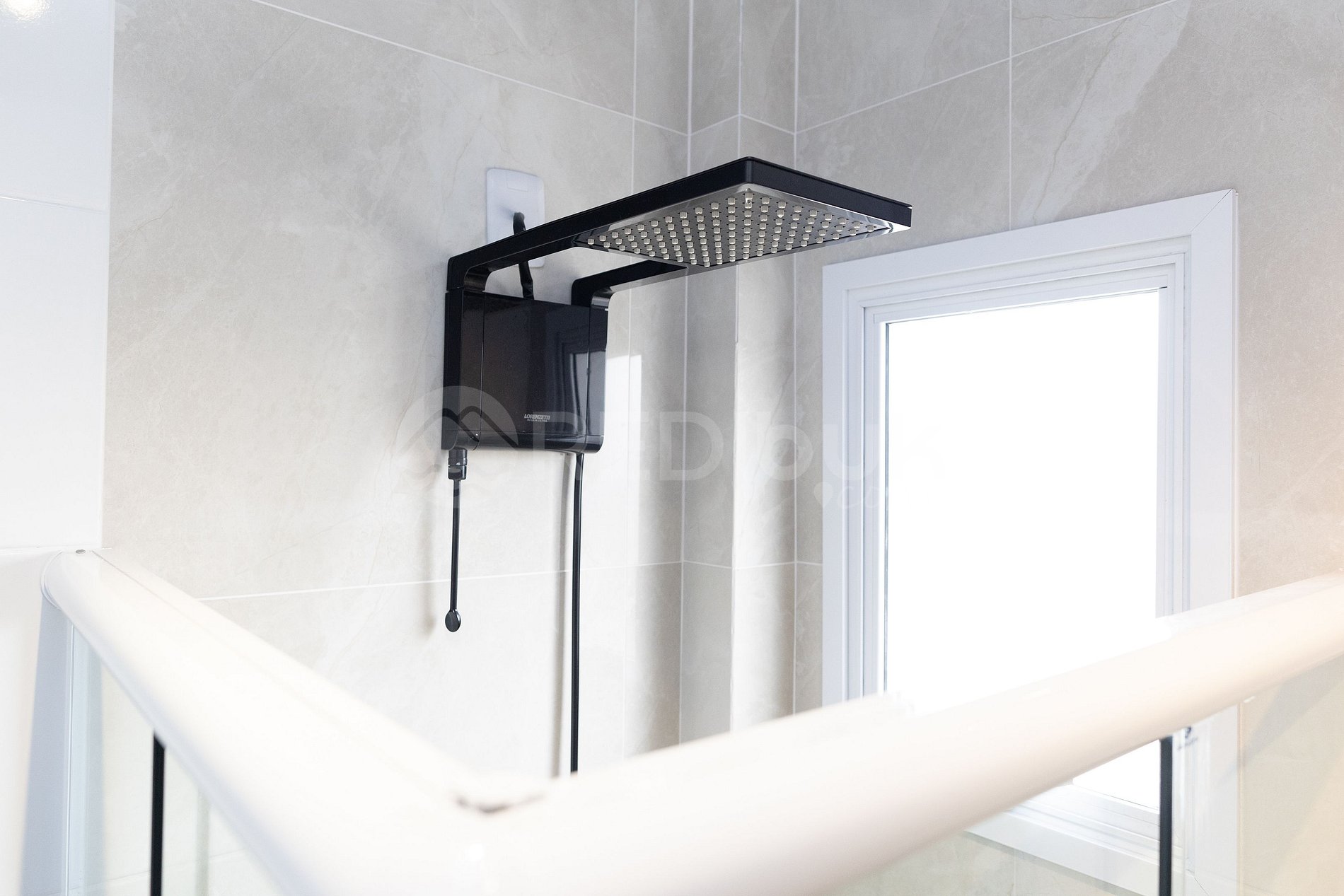 Entre sus comodidades, destacan la vista parcial al mar desde el balcón del piso superior, el aire acondicionado en todas las habitaciones, la cocina completa y el portero electrónico.