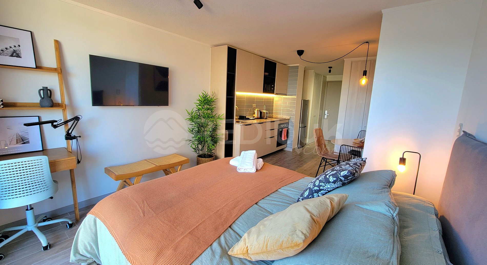 El departamento está completamente equipado para que te sientas como en casa. Incluye Wi-Fi de alta velocidad, cafetera, TV, cama cómoda, cocina equipada y una terraza privada donde podrás relajarte. En los días de calor, disfrutar de un baño en la piscina del edificio será el complemento perfecto.