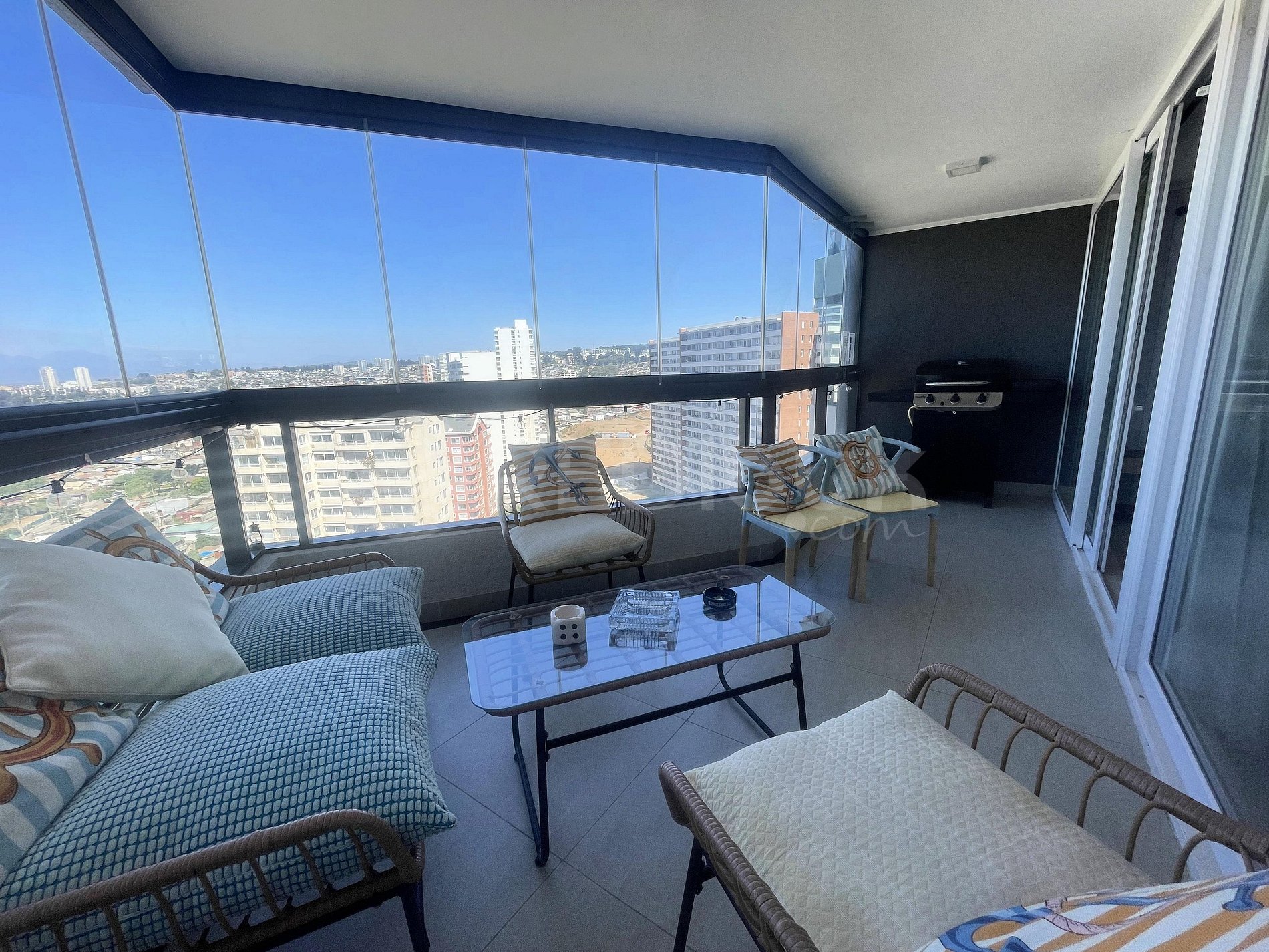 Departamento muy acogedor, soleado e iluminado, ubicado en un piso 17. Con amplia terraza cerrada con vidrio panorámico, la que permitirá disfrutar de la hermosa vista al mar en todas las temporadas. Cuenta con todo lo que necesitas para pasar los días en la V Región.