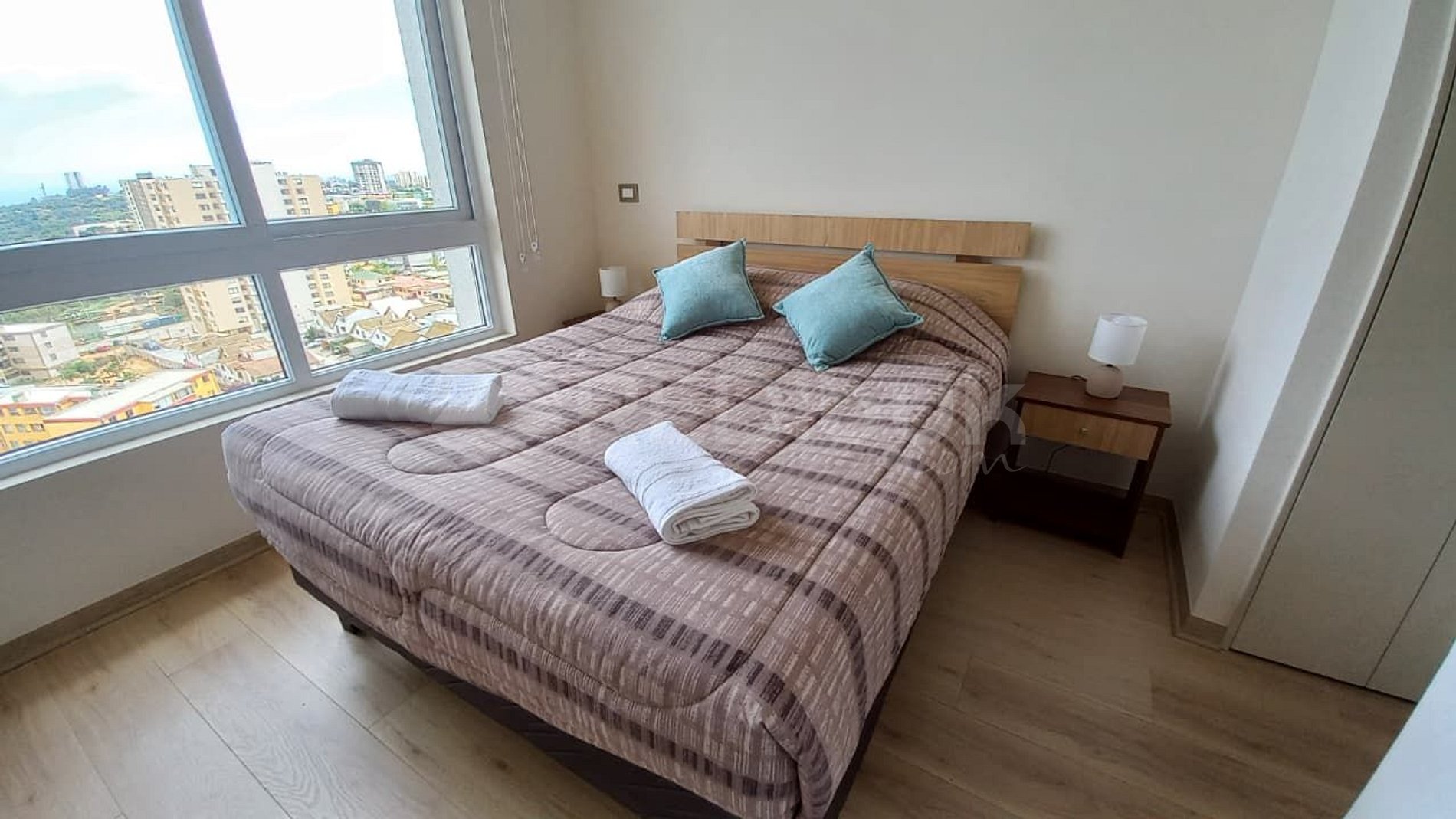 El interior del departamento ofrece ambientes luminosos y acogedores, con cocina full equipada, Wi-Fi, TV, terraza privada, ropa de cama y toallas incluidas, además de amplios ventanales que permiten disfrutar de la luz natural y una vista única y despejada de la ciudad y sus alrededores.. El dormitorio principal cuenta con baño en suite, mientras que el segundo dormitorio y baño independiente aseguran comodidad para todos los huéspedes.