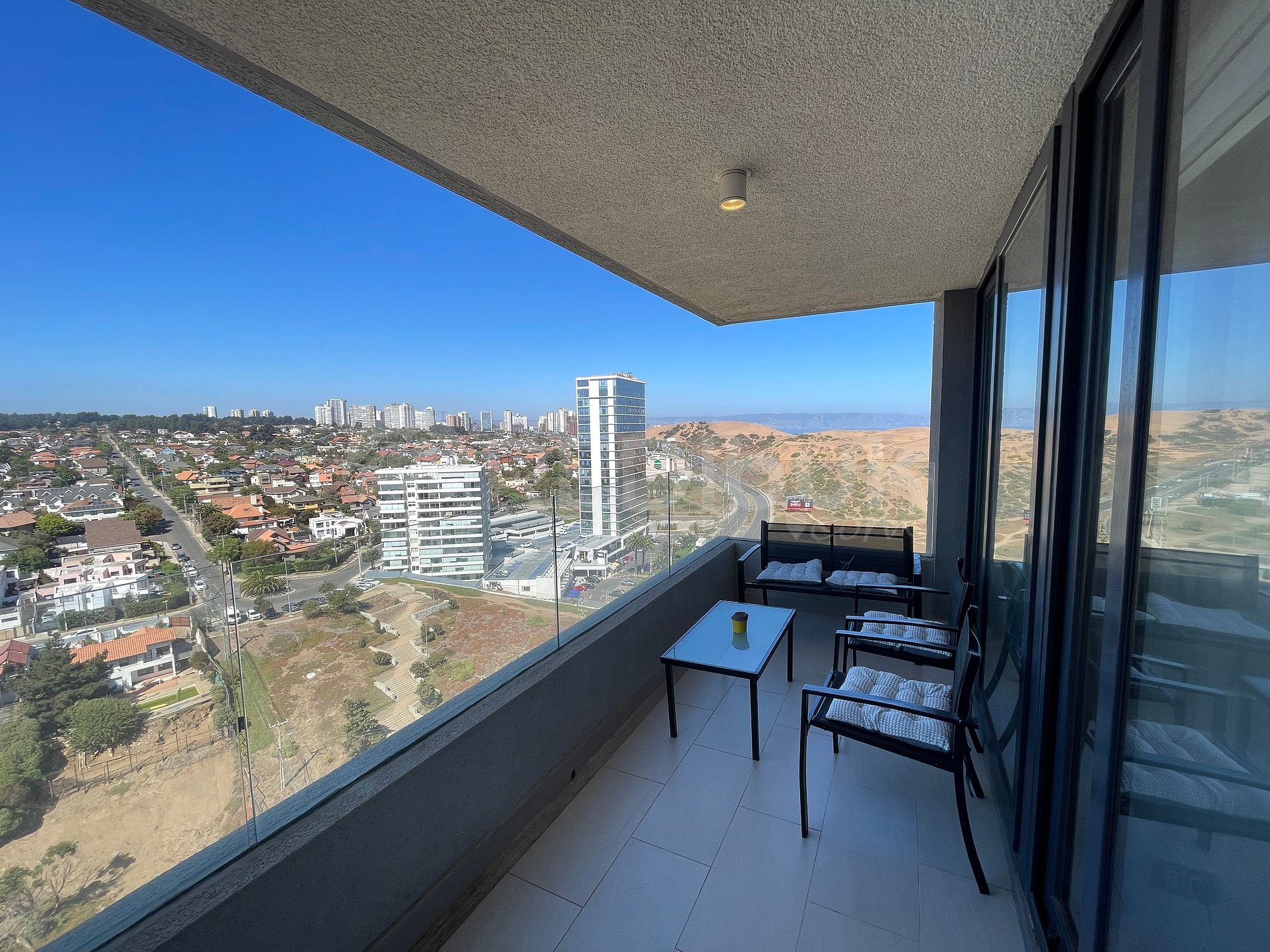 El departamento está en el piso 21, cercano a campo dunar, Viña del Mar . Cuenta con un dormitorio, un baño, living, cocina americana, terraza y todo el equipamiento necesario para una estadía cómoda y sin preocupaciones.