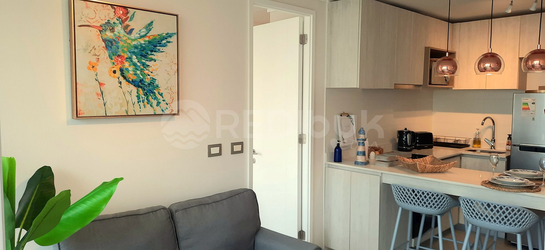 El departamento cuenta con el equipamiento necesario para recibir hasta dos personas de manera cómoda. Su hermosa decoración hará que te sientas como en casa y su amplia terraza con vista despejada te entregará un hermoso atardecer en el mar, entre los edificios aledaños.