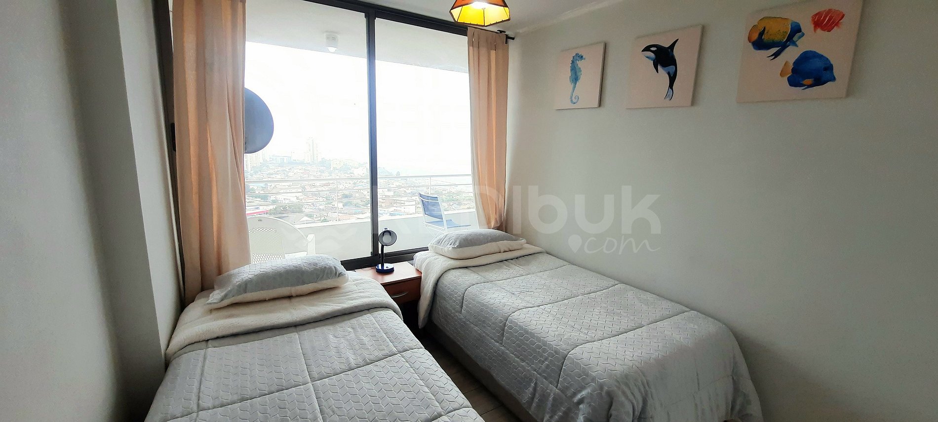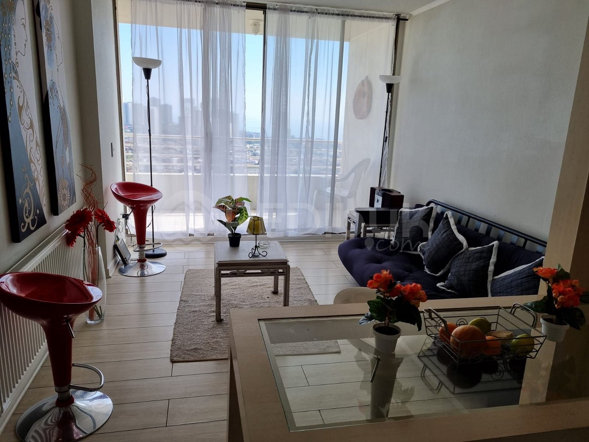El departamento cuenta con dos habitaciones y dos baños y se encuentra equipado para recibir hasta cuatro personas de manera cómoda. Su amplia terraza permitirá ver la bahía de Concón y sus hermosos atardeceres.