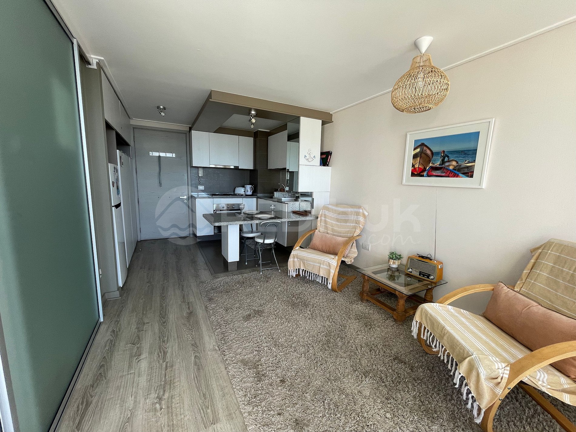 Acogedor espacio totalmente adaptado para una pareja o una familia con 1 hijo, con cocina americana con todos sus utensilios, incluidos cafetera y juguera, living-comedor integrado con parlante, amplia terraza cerrada que conecta todo el departamento con zona de descanso.