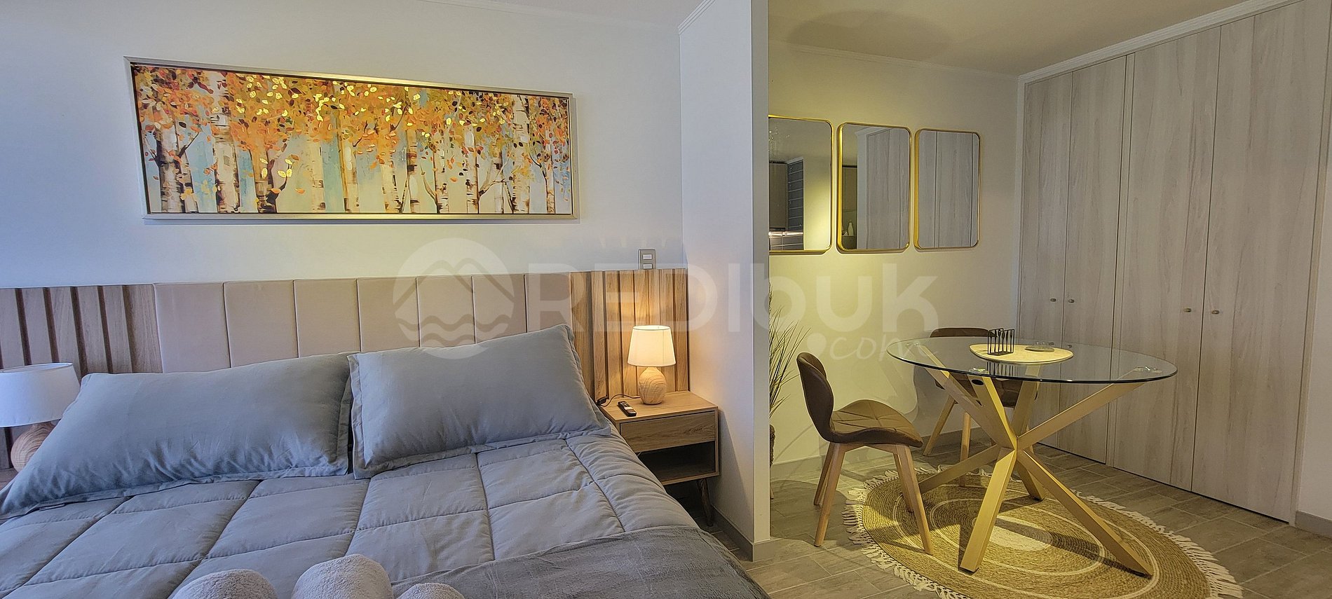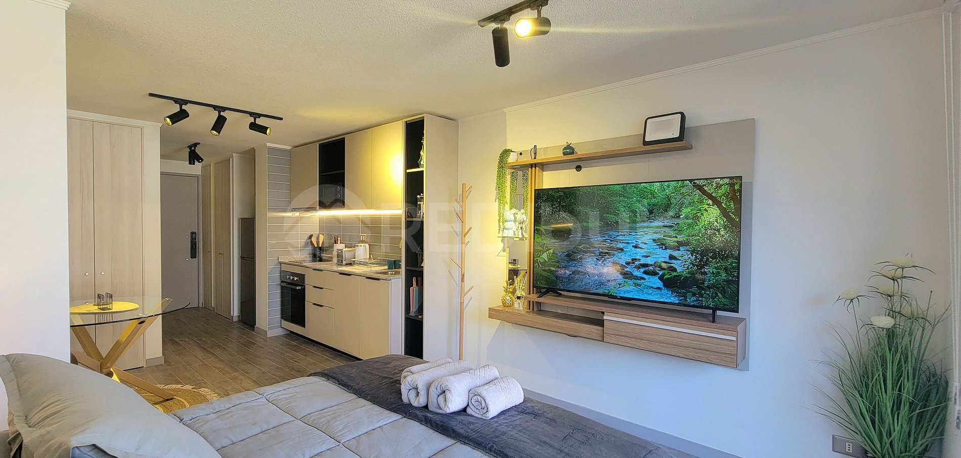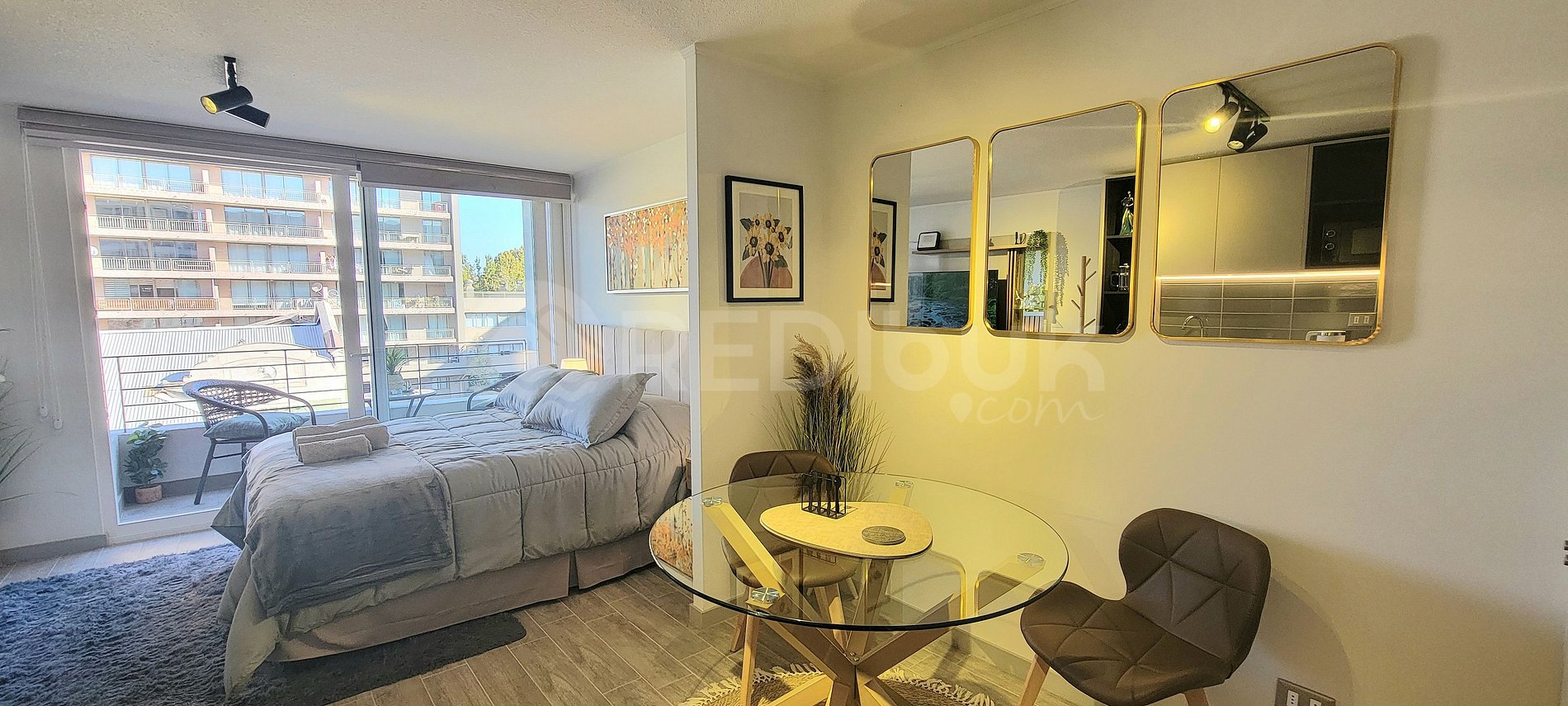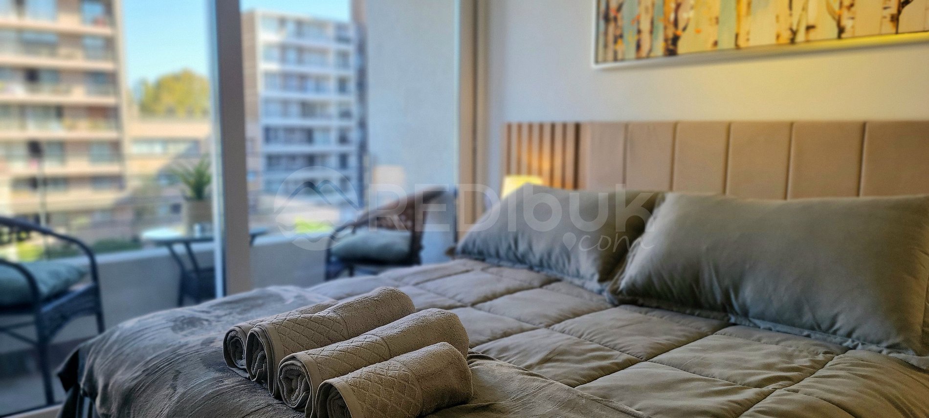 Tiene todo lo necesario para sentirse como en casa: Wi-Fi de alta velocidad, cafetera, TV, cómoda cama, respaldo con luces y enchufes especiales, terraza y cocina full equipada. Un espacio ideal para relajarse luego de un día de recorrer la ciudad. Cuenta con piscina en azotea con sol durante todo el día (verano), ideal para quienes buscan refrescarse en el calor santiaguino. Terraza con arboles grandes que la mantienen fresca.