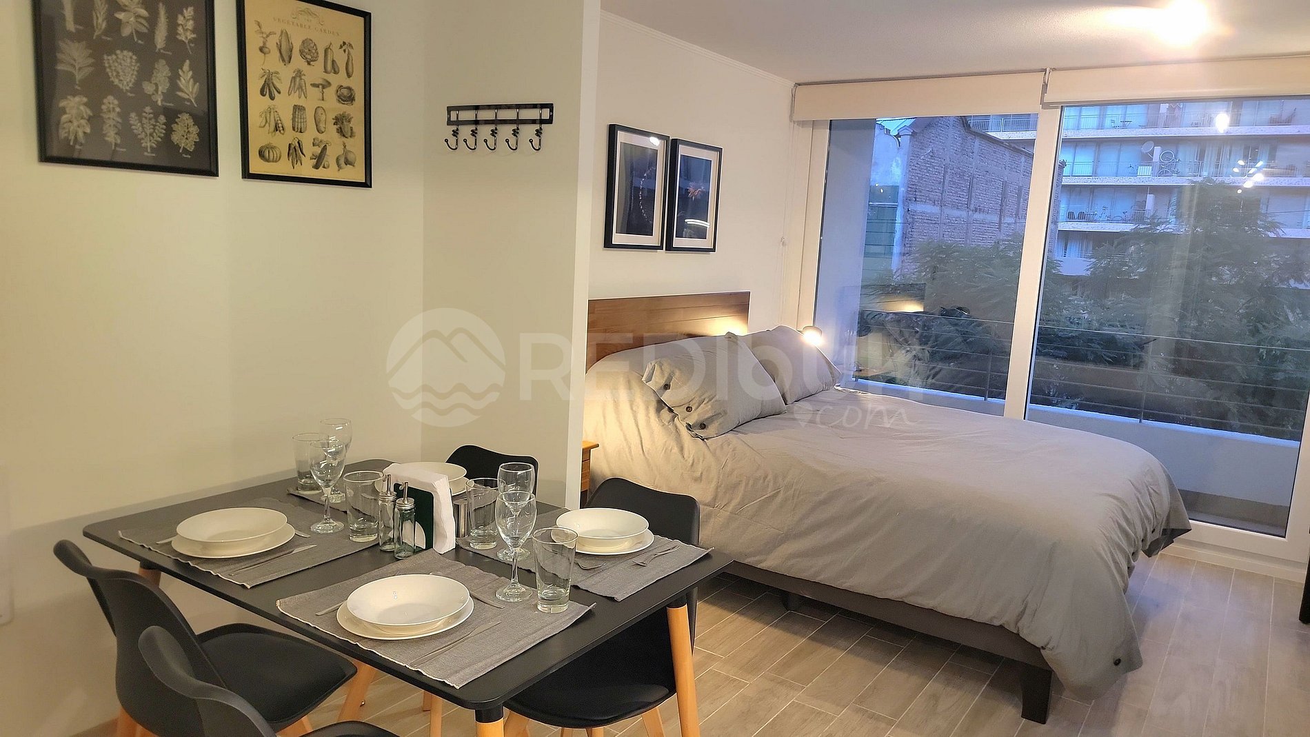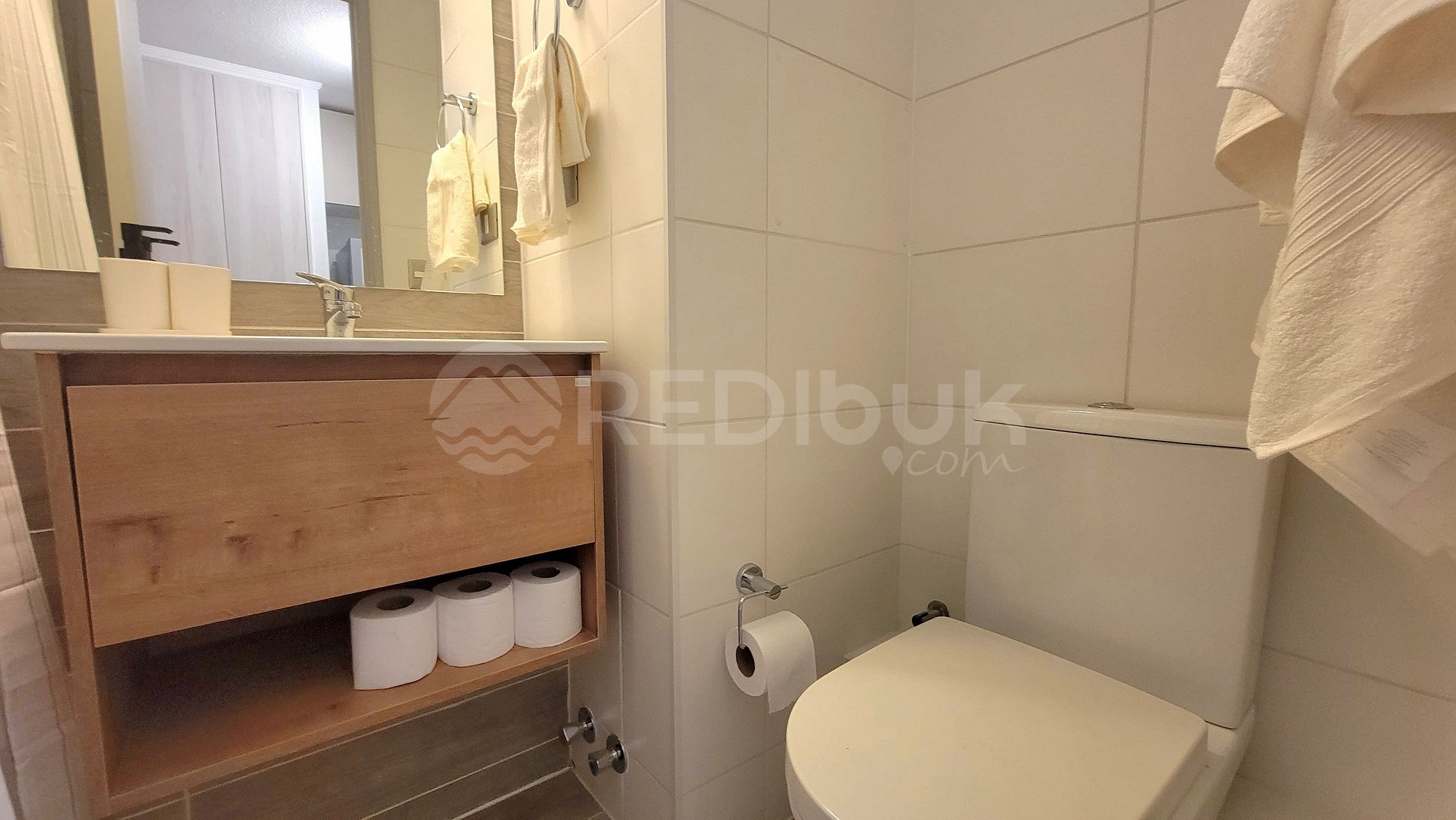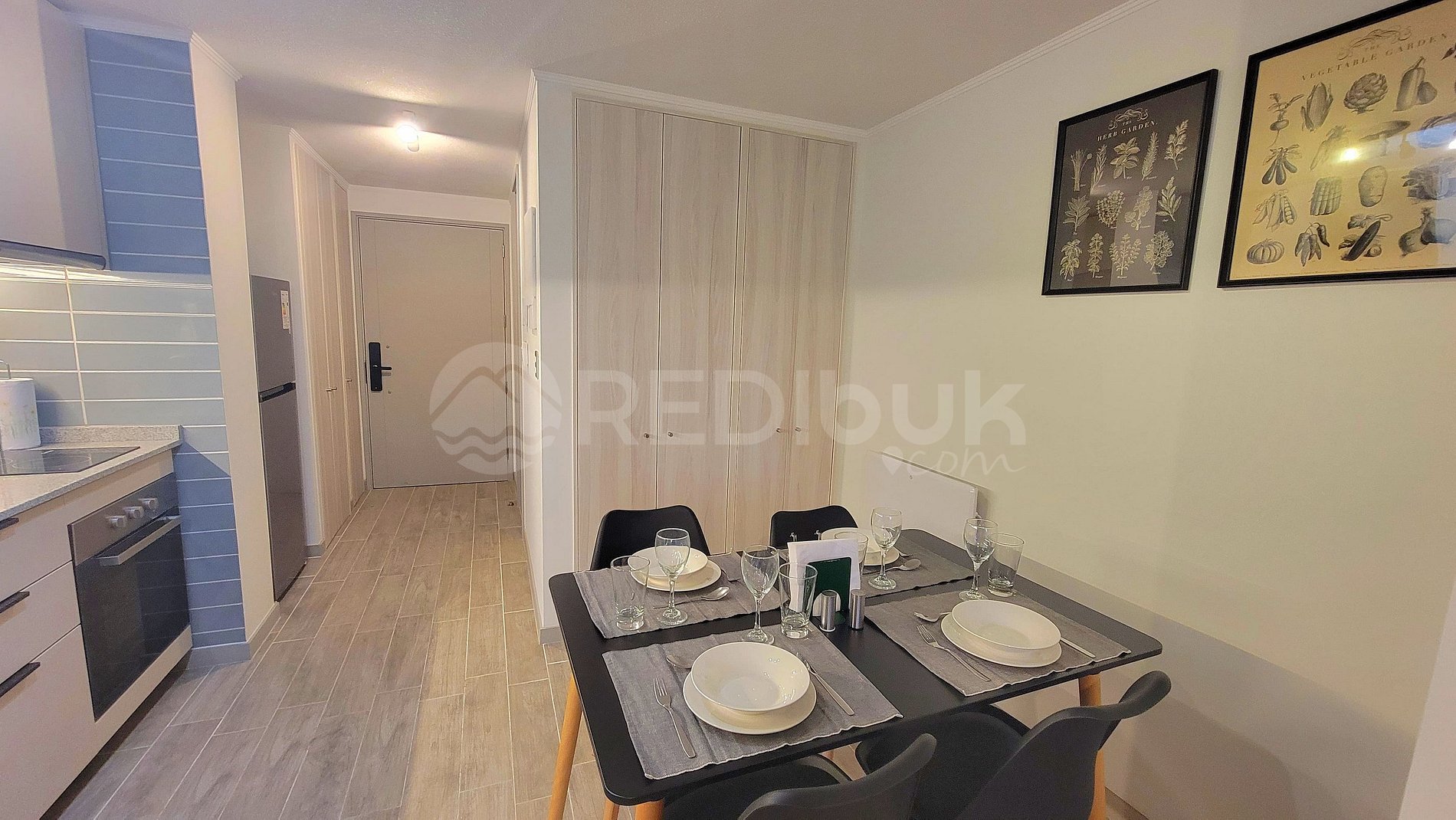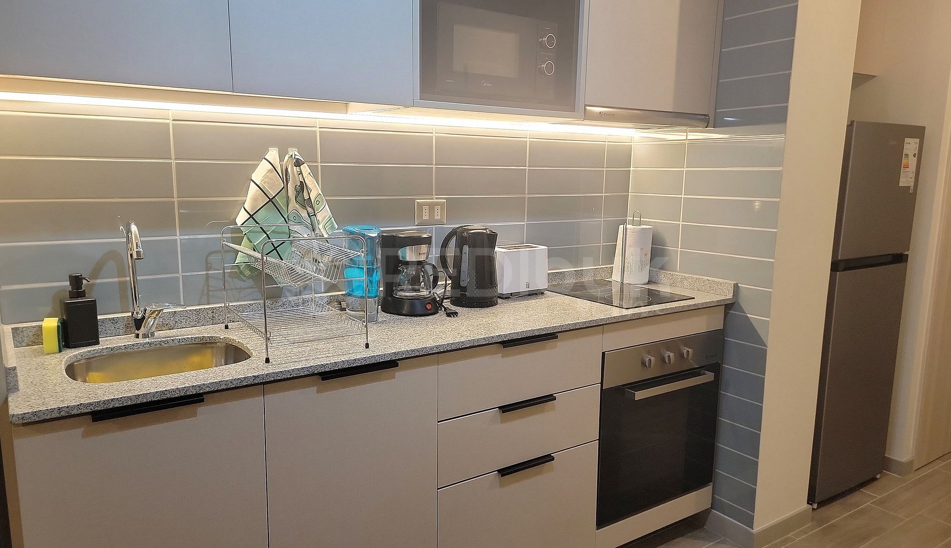 El departamento está completamente equipado para que te sientas como en casa. Incluye Wi-Fi de alta velocidad, cafetera, TV, cama cómoda, cocina equipada y una terraza privada donde podrás relajarte. En los días de calor, disfrutar de un baño en la piscina del edificio será el complemento perfecto.