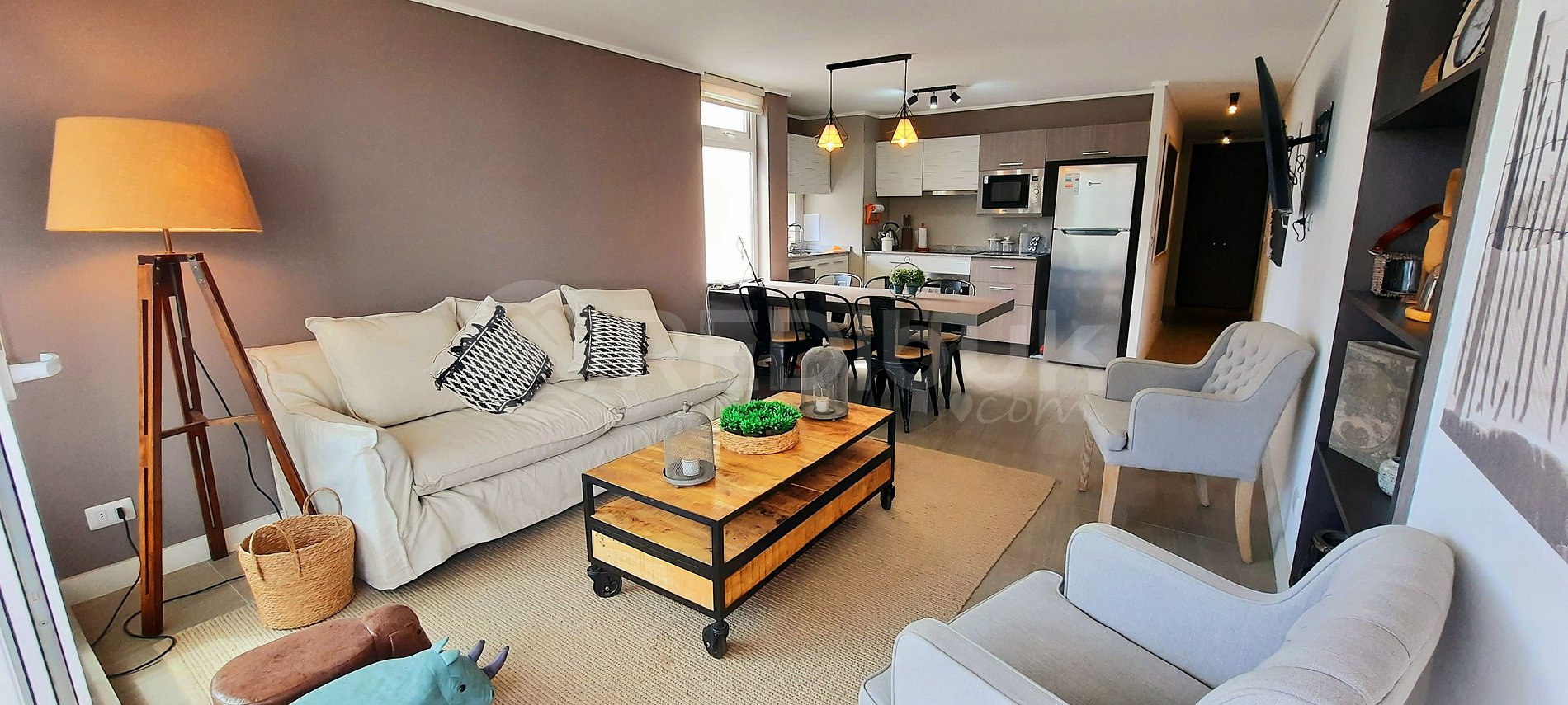 El departamento se encuentra totalmente equipado para recibir hasta cinco personas, cuenta con tres cómodas habitaciones y dos baños. Ubicado en un central y exclusivo sector de Concón.