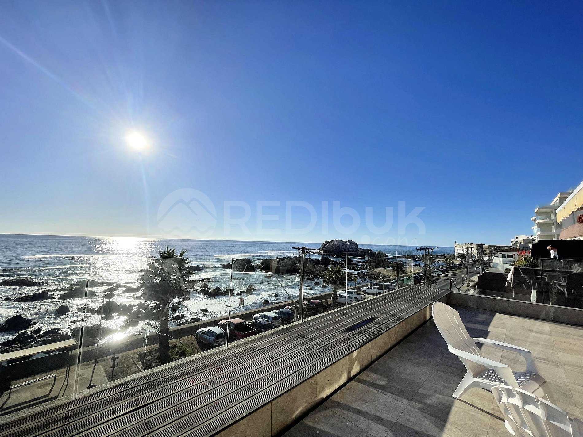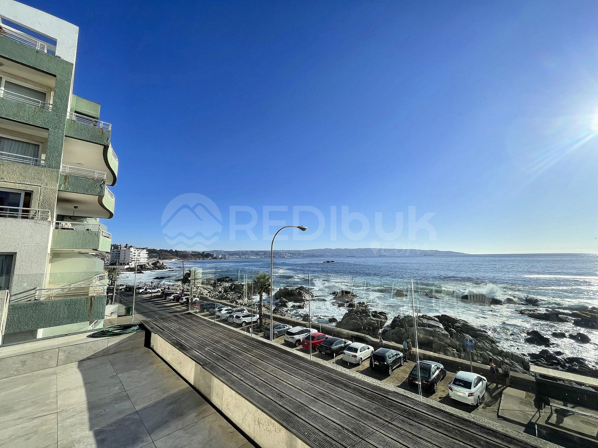 Ubicado directamente en primera línea del mar en un sector tranquilo, residencial y vacacional. Alrededor solo se encuentran residencias y playa. Cuenta con locomoción pública en la puerta del edificio, por lo que facilitará su estancia a la hora de querer desplazarse de manera libre. Su principal atracción son las playas aledañas, playa Reñaca y playa Cochoa con sus restaurantes que ofrecen variedad gastronómica para todos los gustos.