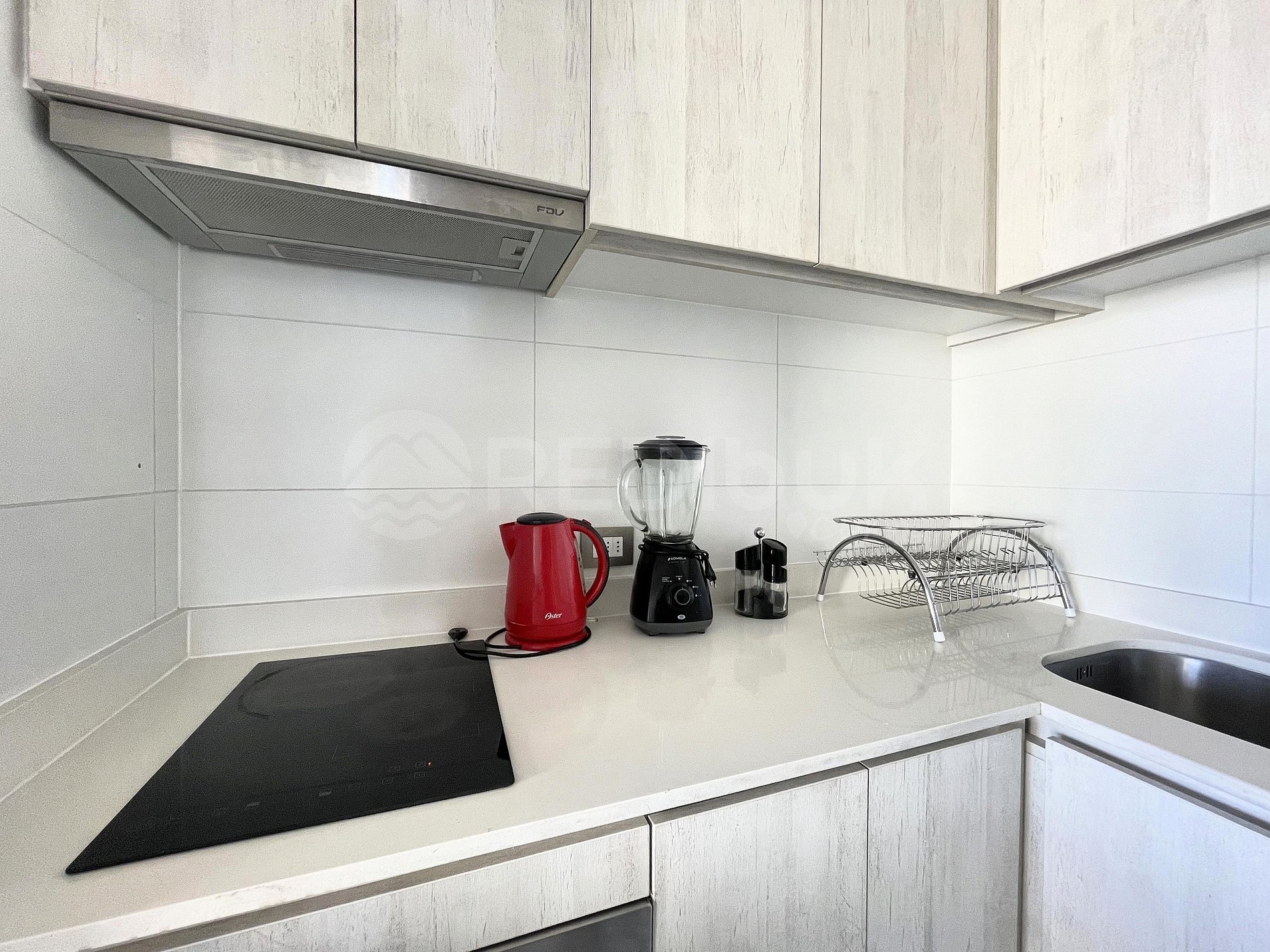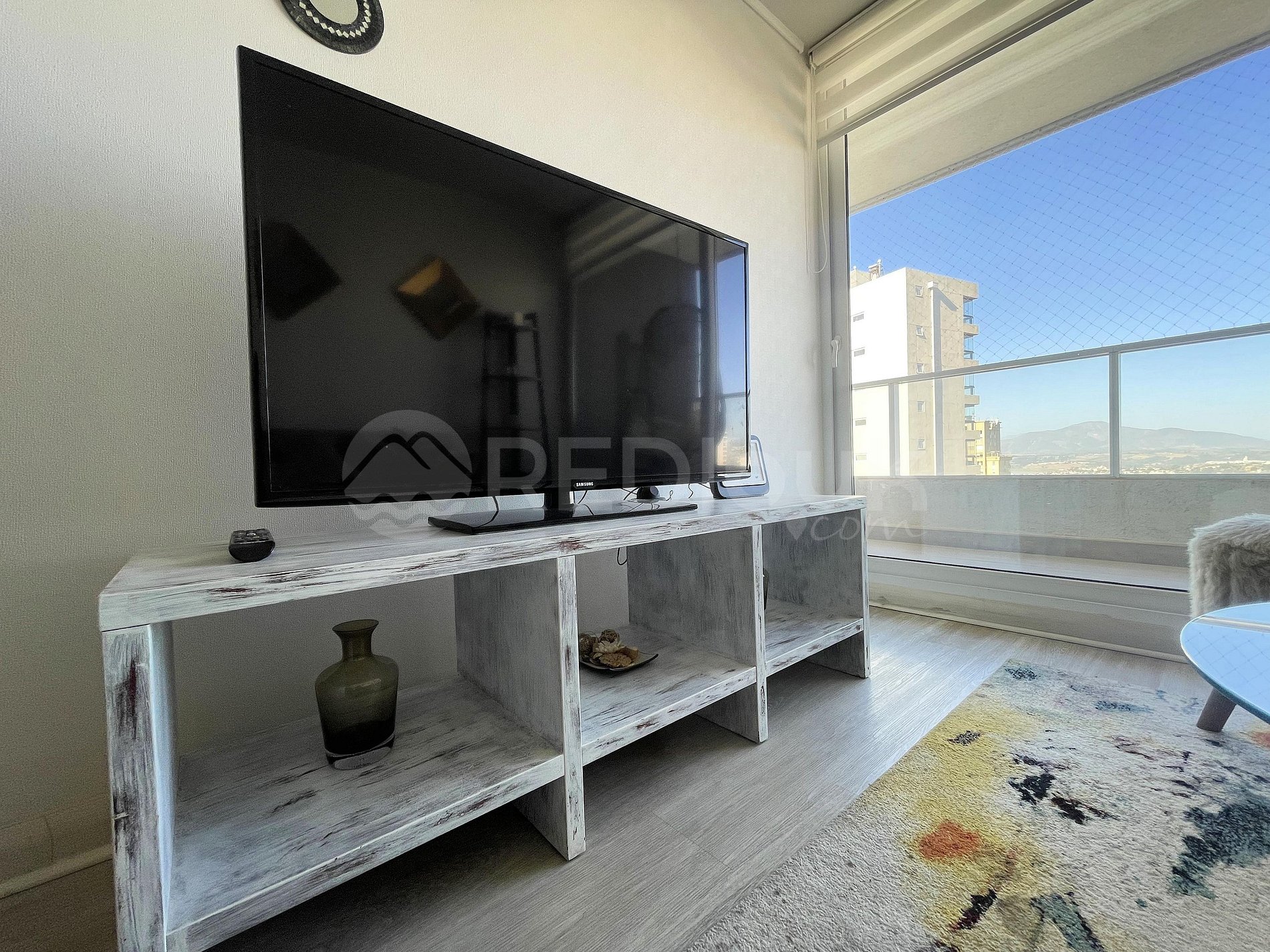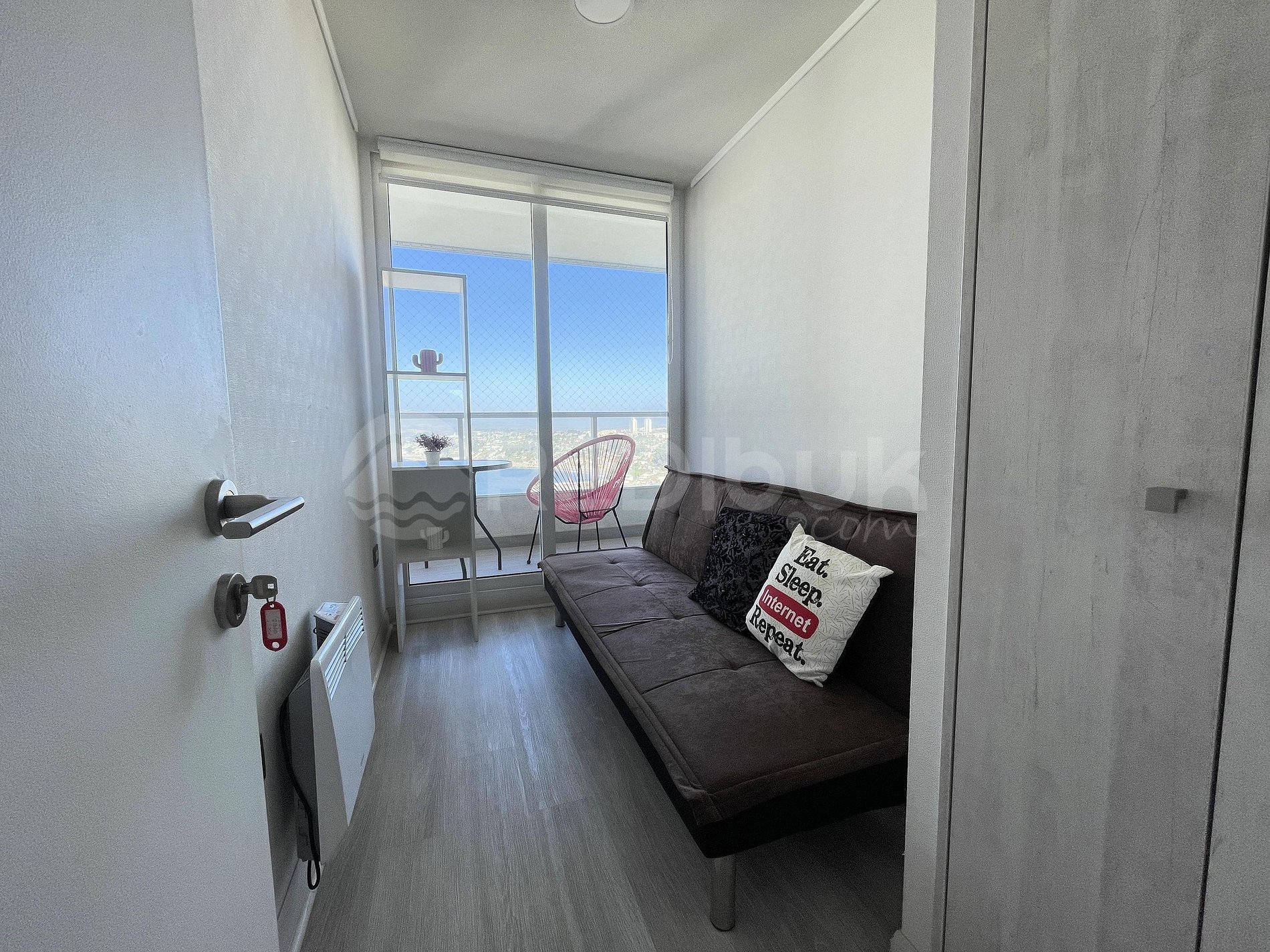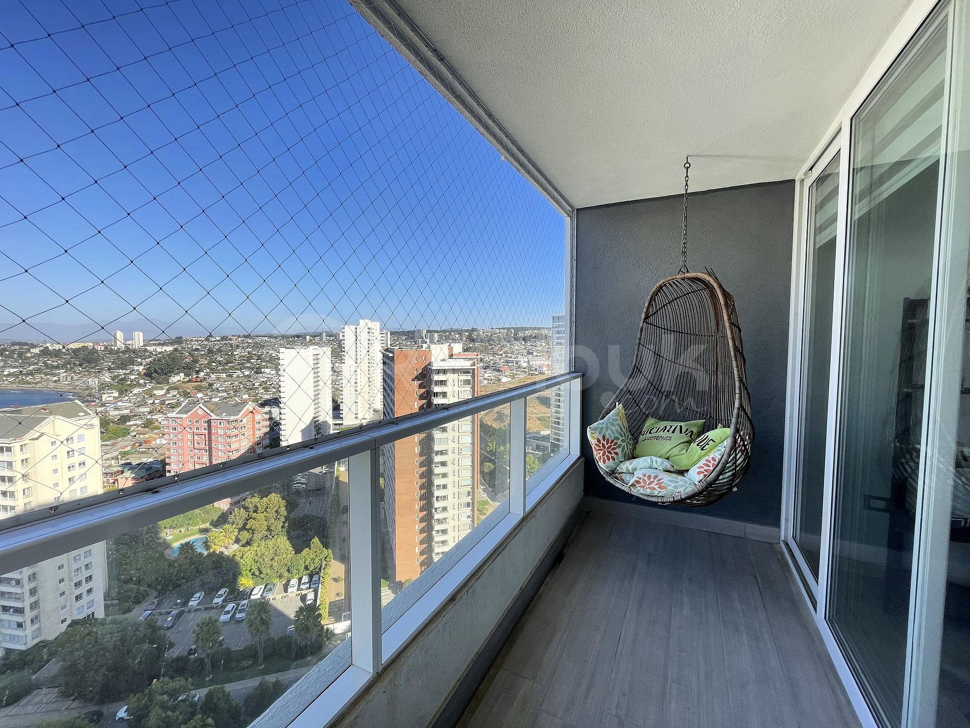 El departamento cuenta con el equipamiento necesario para recibir hasta 3 personas de manera cómoda. Su hermosa decoración hará que te sientas como en casa y su amplia terraza con silla colgante con te entregará un único momento descansando frente al mar, entre los edificios aledaños. Para resguardo de niños, la terraza cuenta con malla de seguridad.