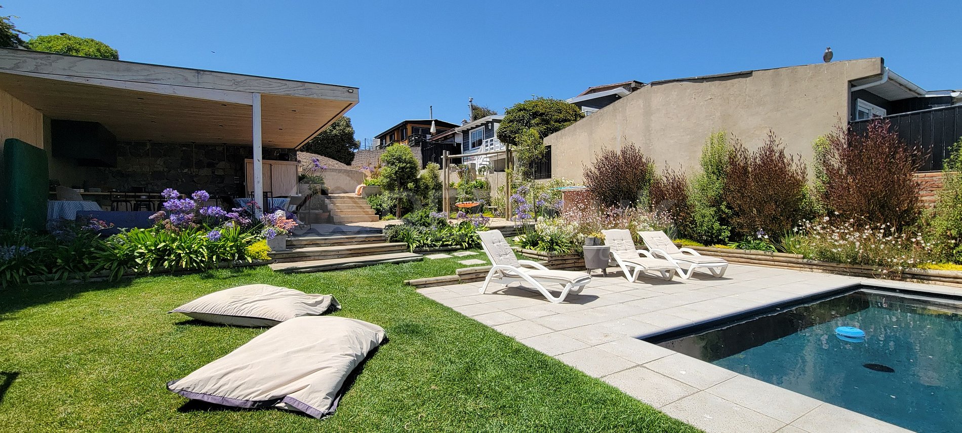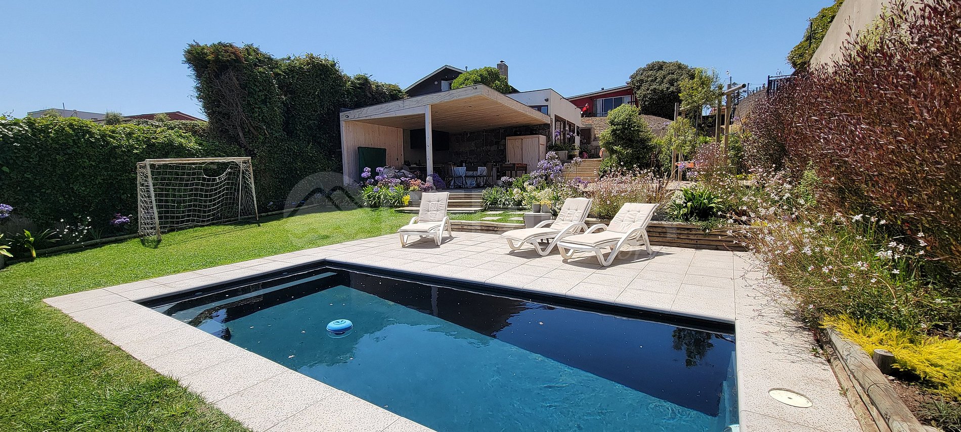 Disfruta un momento de relajo a pasos de la playa con una hermosa vista y un jardín maravilloso, piscina, parrilla, la casa posee calefacción por medio de una chimenea a leña en el living y muchos espacios distintos para poder disfrutar la gastronomía local junto a tu familia.