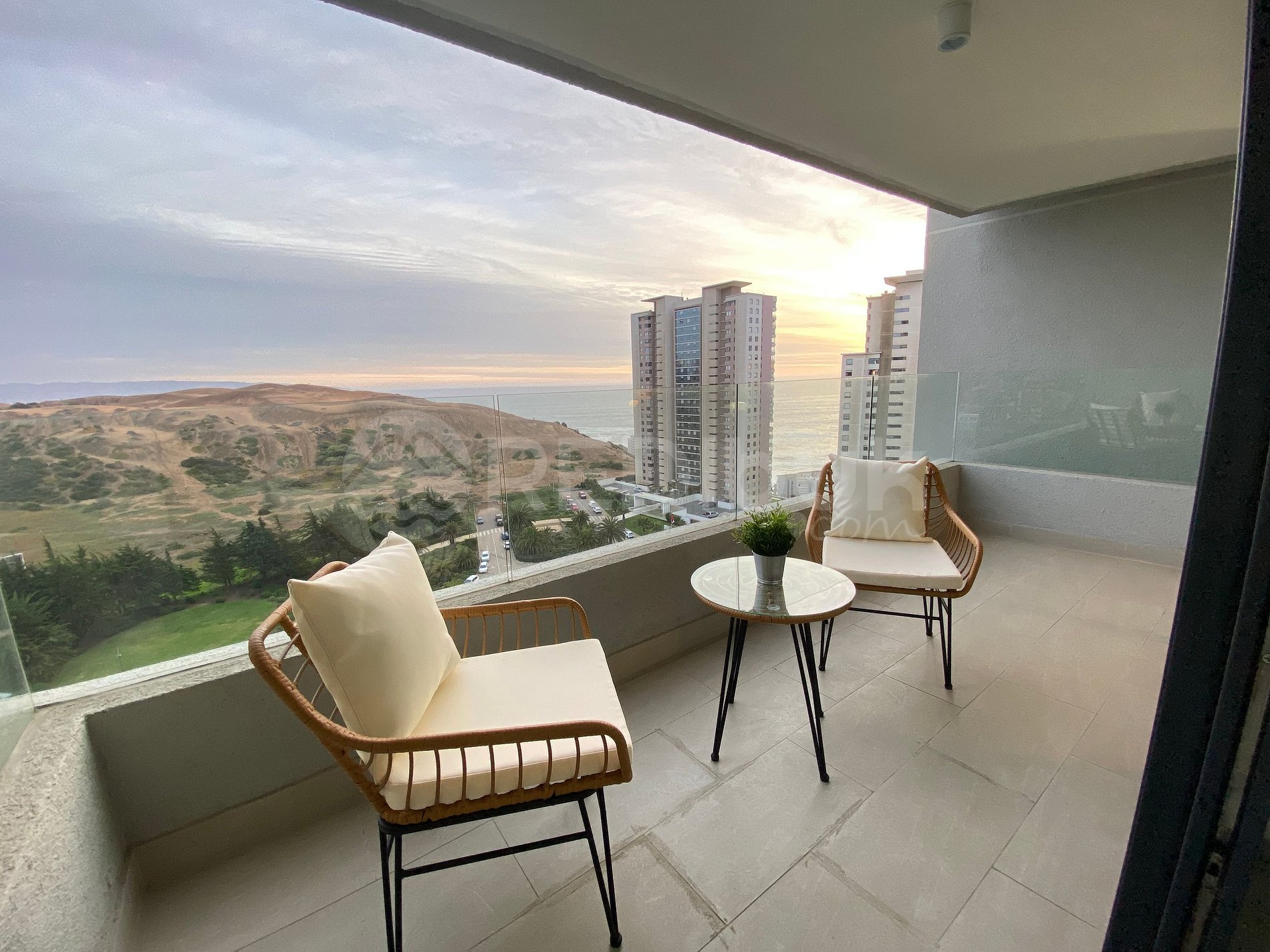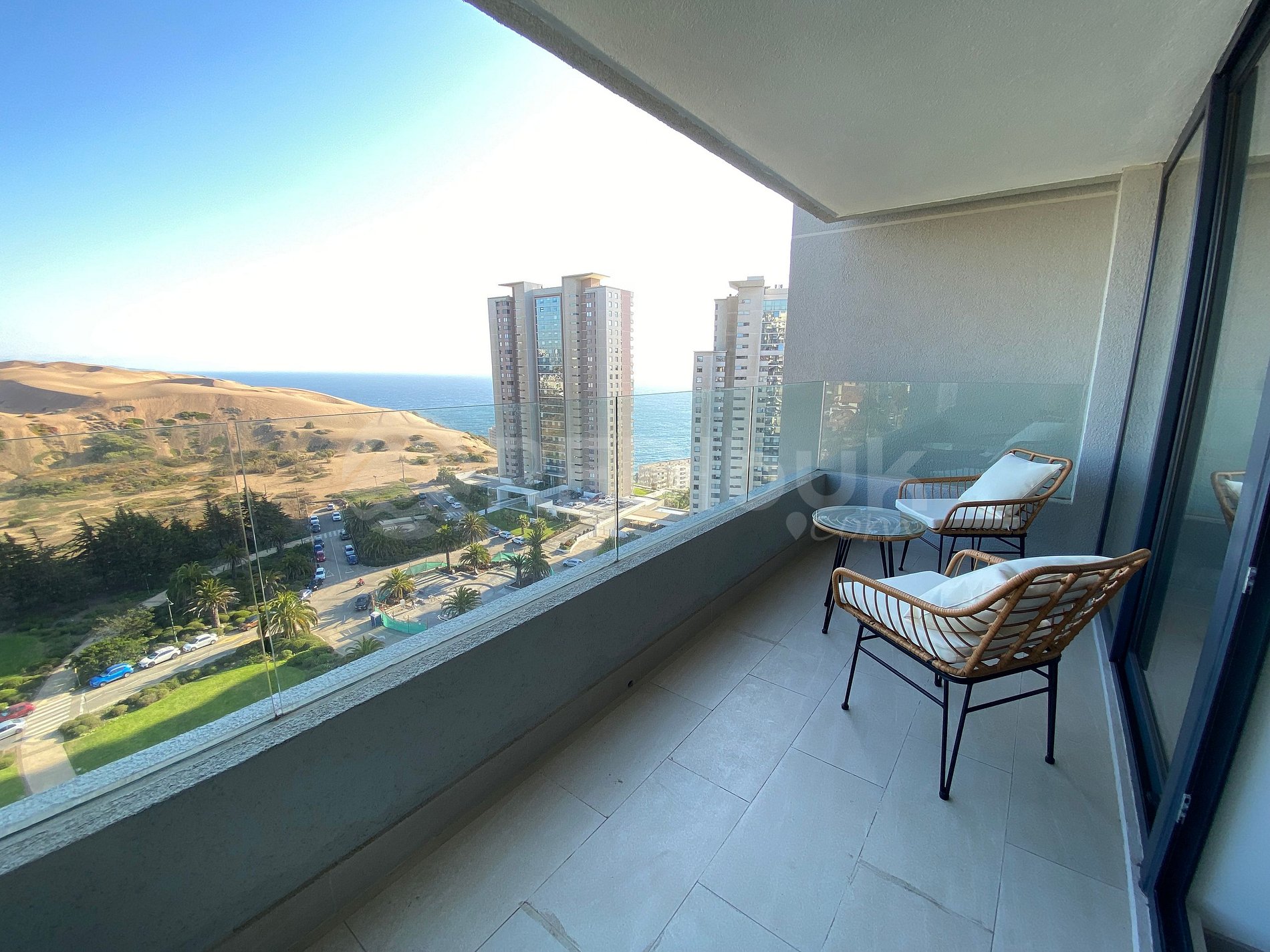 El departamento está en el piso 17, lo que permite tener una vista maravillosa al campo dunar, Viña del Mar y al océano, además de unos hermosos atardeceres entre el mar y las dunas. Cuenta con un dormitorio, un baño, living, cocina americana, terraza y todo el equipamiento necesario para una estadía cómoda y sin preocupaciones.